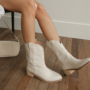 小池在首尔新款刺绣时装靴尖头中筒街头西部牛仔靴复古...