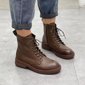 系带马丁靴女真皮英伦风chic骑士靴女粗跟平底机车...