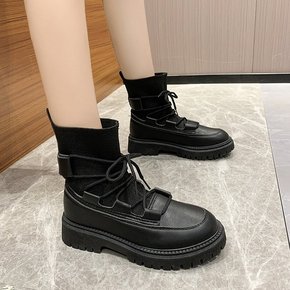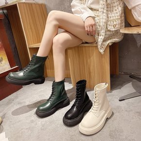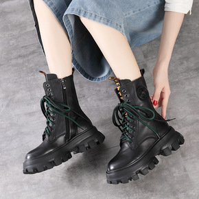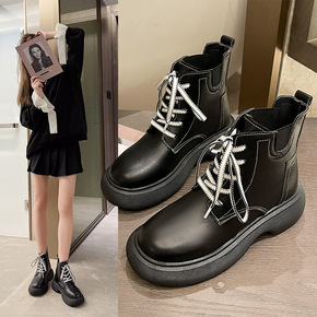 弹力靴2021秋冬季新款方跟厚底系带马丁靴女搭英伦...