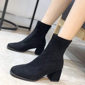 2021冬季新款韩版绒面方头女靴粗跟高跟短靴女鞋子...