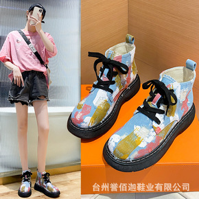 高帮帆布鞋女2021秋冬季新款马丁靴网红迷彩时装靴...