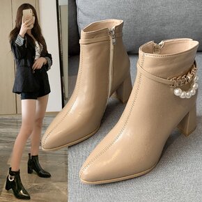 短筒马丁靴2021新款高跟尖头靴子女秋冬季珍珠链粗...
