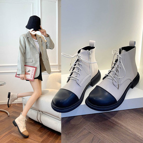短靴女2021秋季新款粗跟圆头系带马丁靴英伦风新款...
