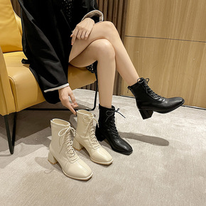 英伦风纯色系带时尚女靴2021网红同款瘦瘦靴圆头马...
