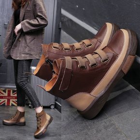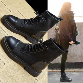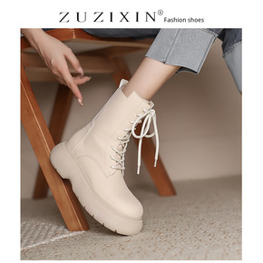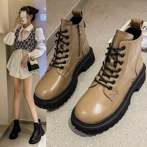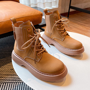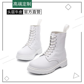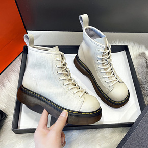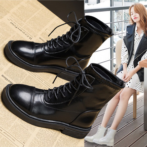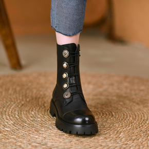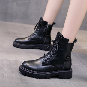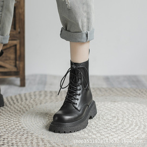 秋冬新款纽扣马丁靴女圆头牛皮英伦风厚底侧拉链休闲网...