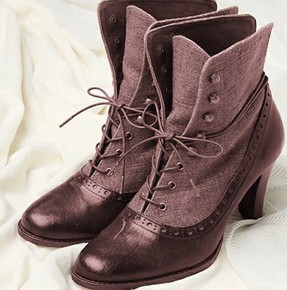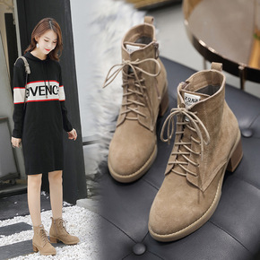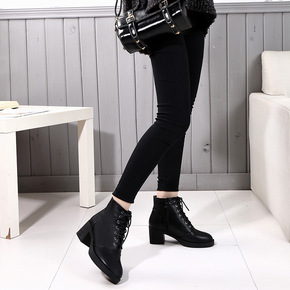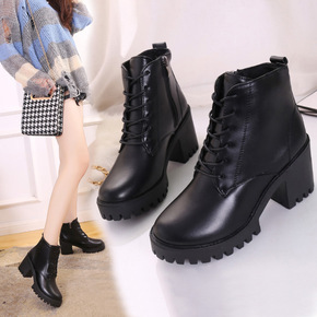 2020秋冬新款纯色加绒马丁靴前系带高跟圆头妈妈鞋...