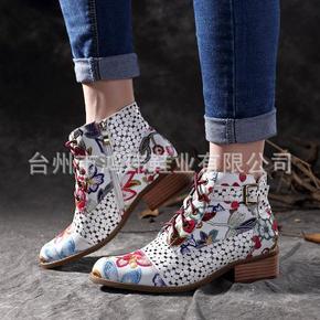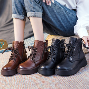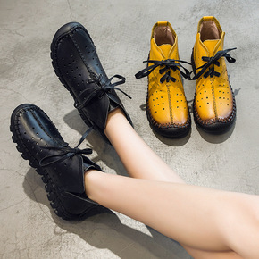 2019秋季新款系带手工缝制温州真皮皮靴平底女鞋洞...