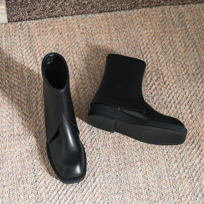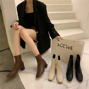 韩版方头粗跟短靴女2022新款时尚软皮百搭后拉链中...