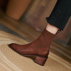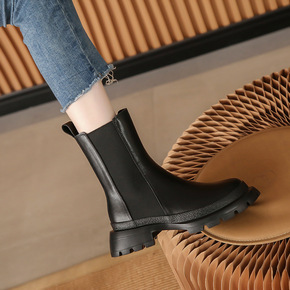 短靴女圆头粗跟切尔西靴2021秋冬mona同款烟筒...