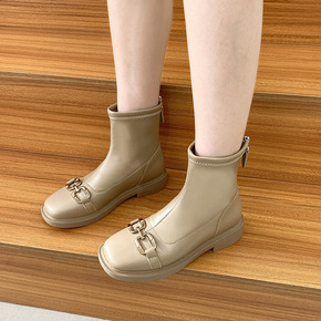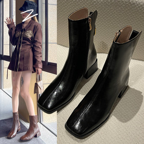 短靴女2021秋冬季新款方头金属装饰后拉链方跟瘦瘦...