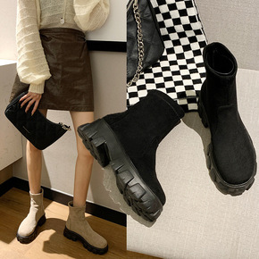马丁靴女2021秋冬款圆头厚底简约弹力烟筒靴英伦风...