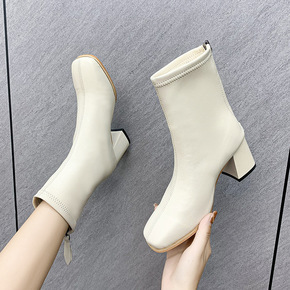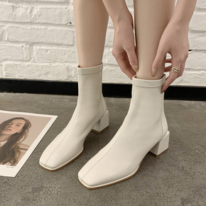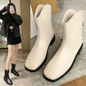 时尚方头短靴女2021秋冬新款皮面瘦瘦靴欧美风切尔...