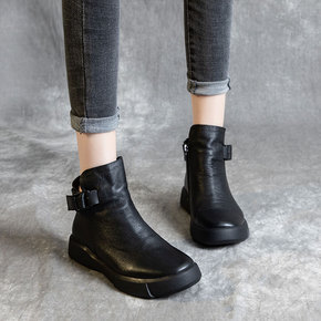2021年新款秋真皮单靴女薄款简约百搭小短靴后拉链...