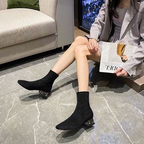 2021秋新款显瘦粗跟弹力瘦腿袜子靴女鞋高跟高帮女...