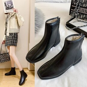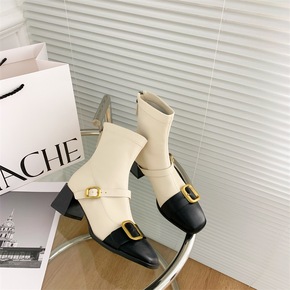 2021新款复古皮带方扣短靴拼色方头粗跟后拉链靴子...