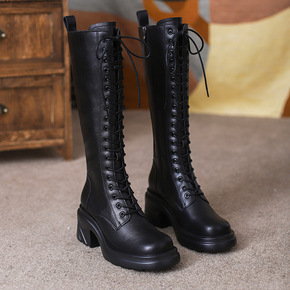 骑士靴女厚底高筒靴子长筒系带马丁靴2021新款粗跟...
