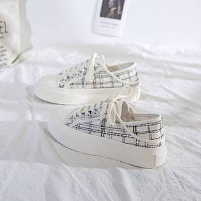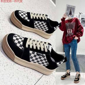 港风复古帆布鞋女潮2022年新款原宿风超火格子板鞋...
