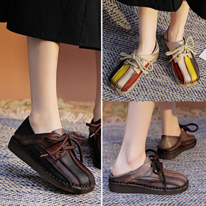 女鞋妈妈鞋真皮秋冬季2021新款平底手工拼色休闲牛...