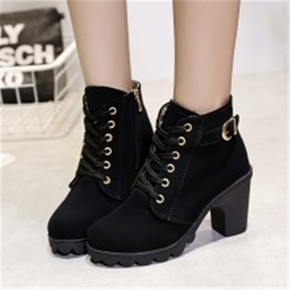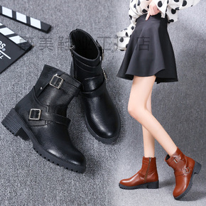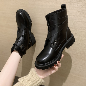 欧美外贸马丁靴女wish粗跟圆头短靴皮带扣女式平底...