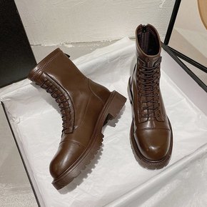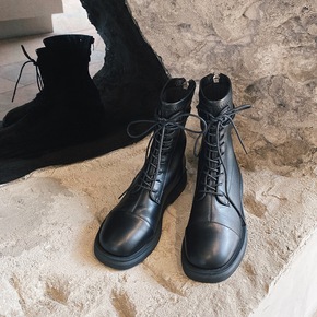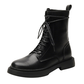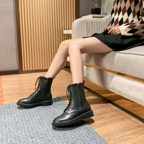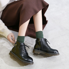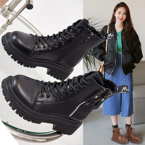 平底圆头中筒马丁靴女加绒英伦风系带短靴双面拉链时装...