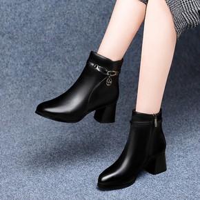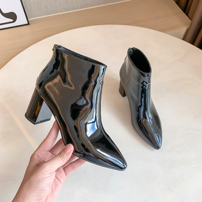 马丁靴女2021秋冬新款短筒粗跟尖头短靴时尚高跟侧...
