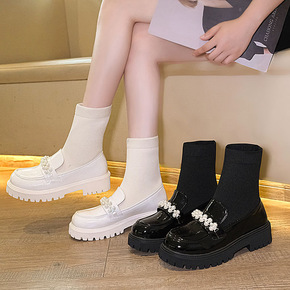 2021新款珍珠链条侧拉链马丁靴女短靴速卖通粗跟厚...