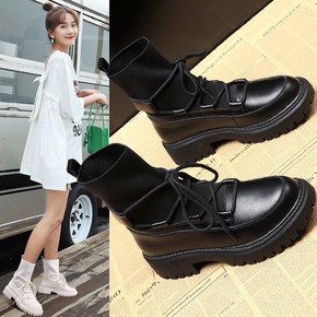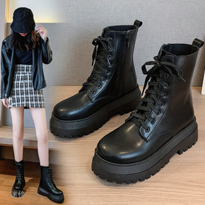 圆头厚底马丁靴女2021新款踝靴英伦风加绒烟筒小短...