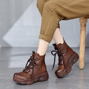 小熊底复古真皮女靴松糕靴子真皮2021秋冬新款牛皮...