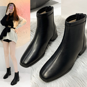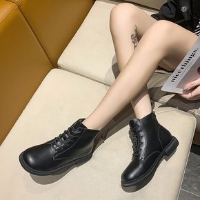 短靴女2021年秋冬新款英伦风方头粗跟帅气马丁靴后...