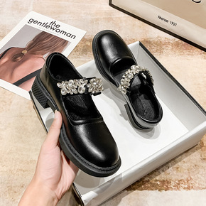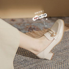 2021秋季小皮鞋珍珠单鞋女高跟粗跟方头通勤软底透...