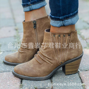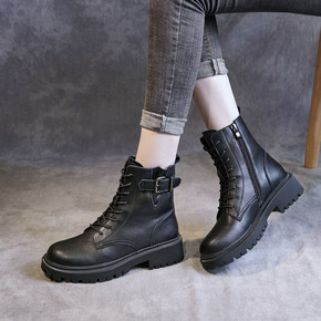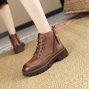 特价主推款 牛皮女鞋2021秋冬新款女靴粗跟短靴平...