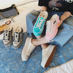 2021年秋新款帆布鞋女半拖鞋韩版学生休闲厚底内增...
