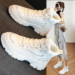 猫头真皮小白鞋女老爹鞋2022春新款厚底休闲运动鞋...