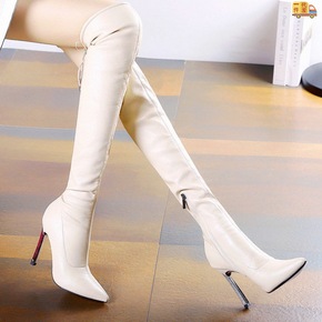 欧美新款炫彩撞色尖头鞋修腿瘦腿过膝弹力长靴超高细跟...