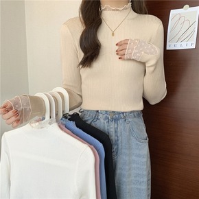 实拍实价 秋冬新款韩版蕾丝拼接针织打底衫毛衣上衣女...