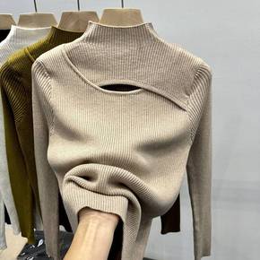挂脖毛衣设计感半高领镂空针织衫女长袖2022春季新...