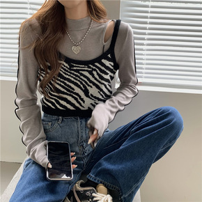 打底衫女秋季内搭修身针织衫半高领长袖上衣斑马纹吊带...