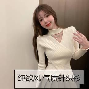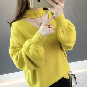 2021秋冬新款性感镂空挂脖毛衣女宽松灯笼袖半高领...
