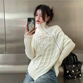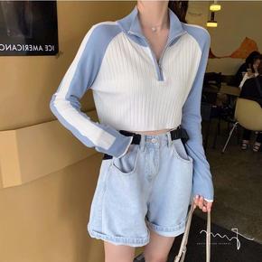 短款拉链高领坑条针织衫潮春秋季短款长袖T恤外穿上衣...