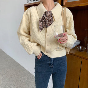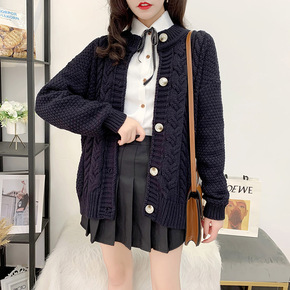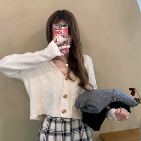 韩国官网秋冬chic复古麻花毛衣女宽松V领开衫毛衣...