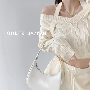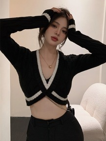 辣妹撞色交叉V领麻花毛衣女春季不规则设计感短款露脐...