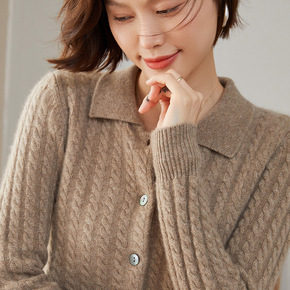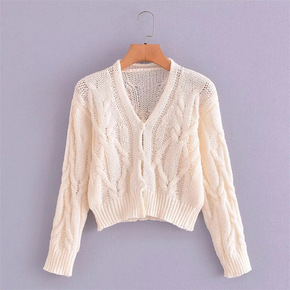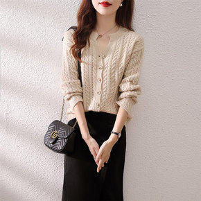 早秋时尚V领麻花针织开衫清新甜美上衣新款轻熟风长袖...