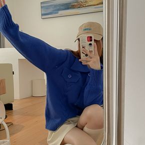 慵懒风翻领麻花针织开衫女秋冬设计感小众克莱因蓝毛衣...