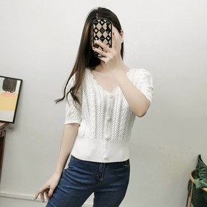 2022夏季新款甜美减龄花边V领泡泡短袖麻花镂空休...