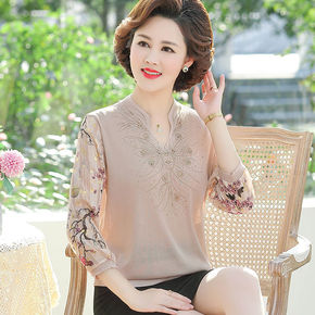 妈妈春夏七分袖T恤中年女士针织纱袖薄打底衫 中老年...