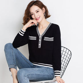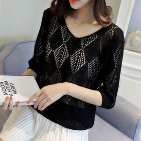 新款夏薄款小香风短袖长袖T恤女宽松显瘦针织衫黑色v...