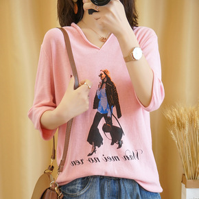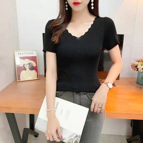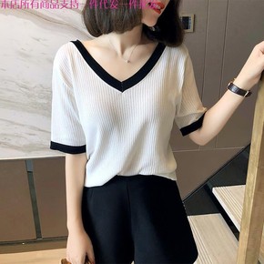 冰丝T恤女外穿夏季新款大码短袖针织衫韩版修身V领打...