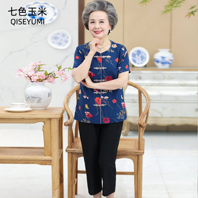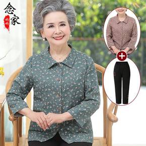 奶奶装春秋纯棉长袖衬衫中老年人秋装女套装老人妈妈衬...