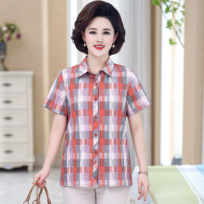 中老年人格子衬衫外套女妈妈纯棉短款开衫60岁70老...