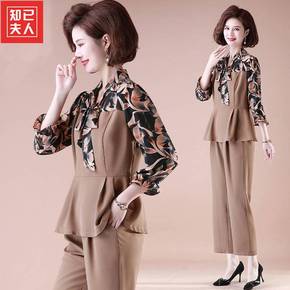 新款妈妈装春装雪纺小衫裤子两件套装中老年女装长袖上...